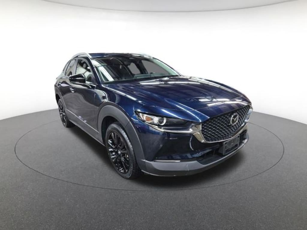 CX-30 2.5 S Select Sport, Balance of Factory Warranty, 4D Sport Utility, SKYACTIV® 2.5L 4-Cylinder DOHC 16V, 6-Speed Automatic, AWD, Deep Crystal Blue Mica, Black Artificial Leather, 4-Wheel Disc Brakes, 4.095 Axle Ratio, 6 Speakers, ABS brakes, Air Conditioning, Alloy wheels, AM/FM radio, AppLink/Apple CarPlay and Android Auto, Auto High-beam Headlights, Automatic temperature control, Brake assist, Bumpers: body-color, Compass, Delay-off headlights, Driver door bin, Driver vanity mirror, Dual front impact airbags, Dual front side impact airbags, Electronic Stability Control, Emergency communication system: Mazda Connected Services (3-year complimentary trial included), Exterior Parking Camera Rear, Front anti-roll bar, Front Bucket Seats, Front Center Armrest, Front dual zone A/C, Front reading lights, Front wheel independent suspension, Fully automatic headlights, Heated door mirrors, Illuminated entry, Knee airbag, Leather Shift Knob, Leather steering wheel, Leatherette Seat Trim, Low tire pressure warning, MAZDA CONNECT Infotainment System, Occupant sensing airbag, Outside temperature display, Overhead airbag, Overhead console, Panic alarm, Passenger door bin, Passenger vanity mirror, Power door mirrors, Power steering, Power Windows, Radio data system, Radio: AM/FM Audio System, Rain sensing wipers, Rear seat center armrest, Rear side impact airbag, Rear window defroster, Rear window wiper, Remote keyless entry, Speed control, Speed-sensing steering, Split folding rear seat, Spoiler, Steering wheel mounted audio controls, Tachometer, Telescoping steering wheel, Tilt steering wheel, Traction control, Trip computer, Turn signal indicator mirrors, Variably intermittent wipers, and Wheels: 18" x 7J Aluminum Alloy.